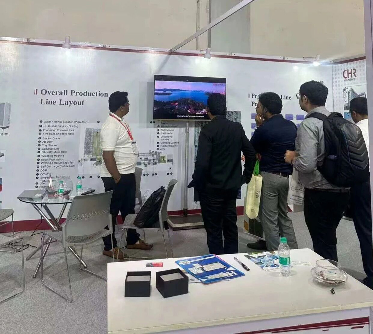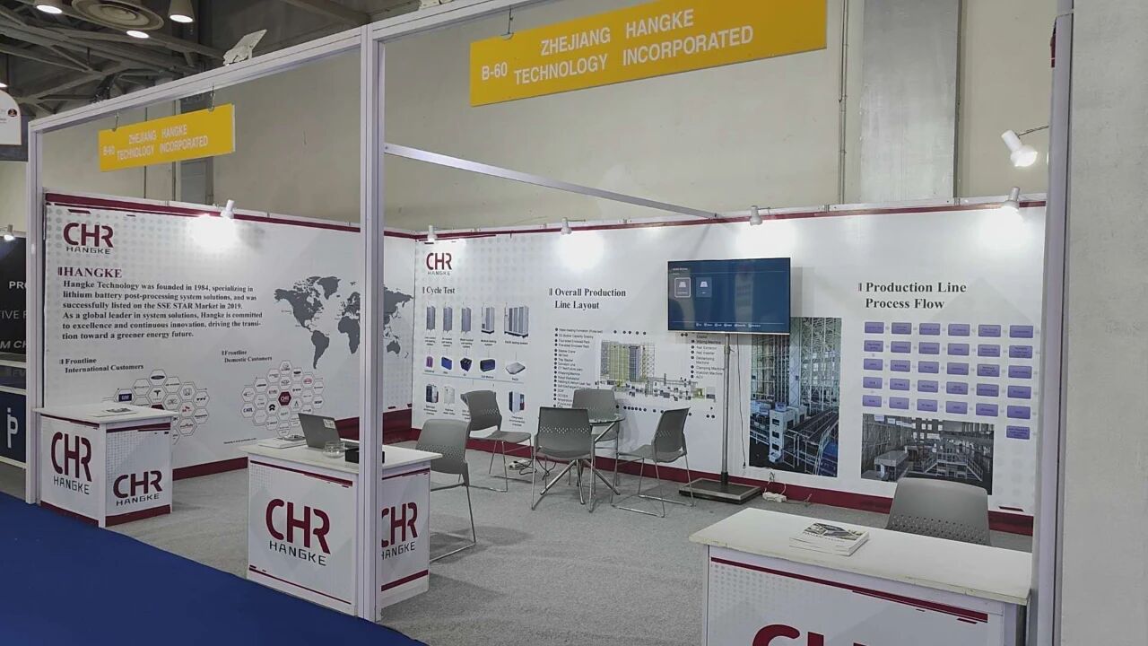 為了在展會中充分展現品牌實力,團隊提前做好全方位籌備。此次展位采用單面開口設計,主背景板重點突出杭可科技在鋰電后端領域的整體解決方案能力,讓觀眾一眼就能獲得到公司的核心優勢。
